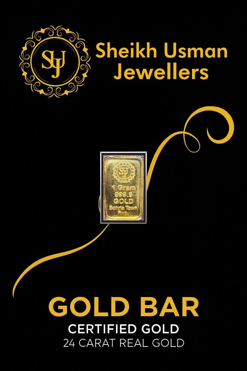 The SUJ One Gram Gold Bar is crafted with 24 Karat 999.9% pure gold, making it the ideal choice for collectors and investors. Each bar is securely sealed to preserve quality, prevent tampering, and ensure long-lasting value. Its compact size makes it a perfect gift or a smart entry point for new investors looking to own real gold from Sheikh Usman Jewellers.